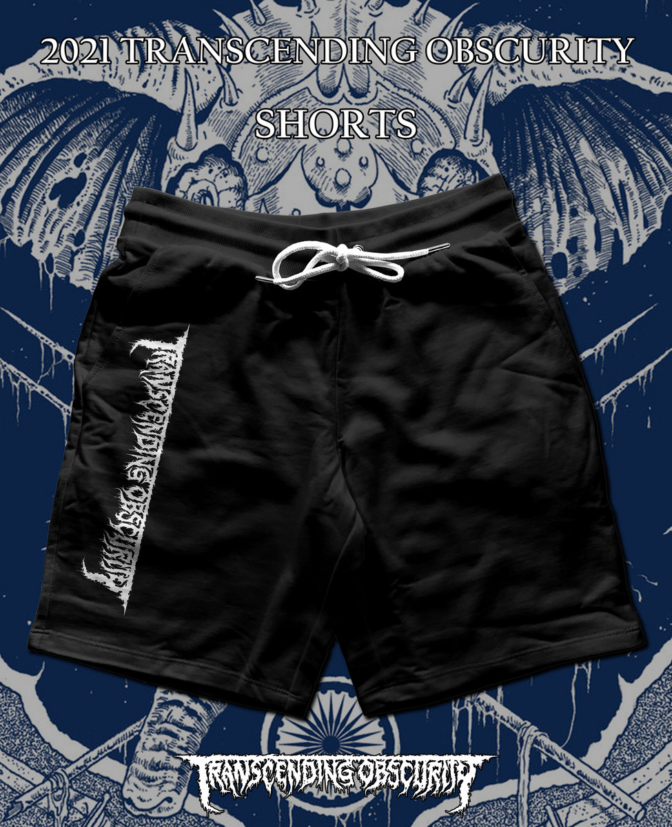 For the first time we're announcing high quality shorts that are made from extra thick and soft 100% cotton material that's furthermore pre-washed to avoid any shrinkage issues. They come with a drawstring for comfortable fitting. There's the Transcending Obscurity logo designed by Mark Riddick printed on the right side and it looks great.